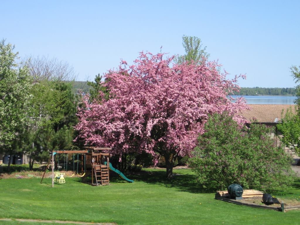 The trees are in full bloom and they dot the shores of the river with explosions of pink, white and purple. This crab tree adds a pop of color to the blue backdrop of the river.