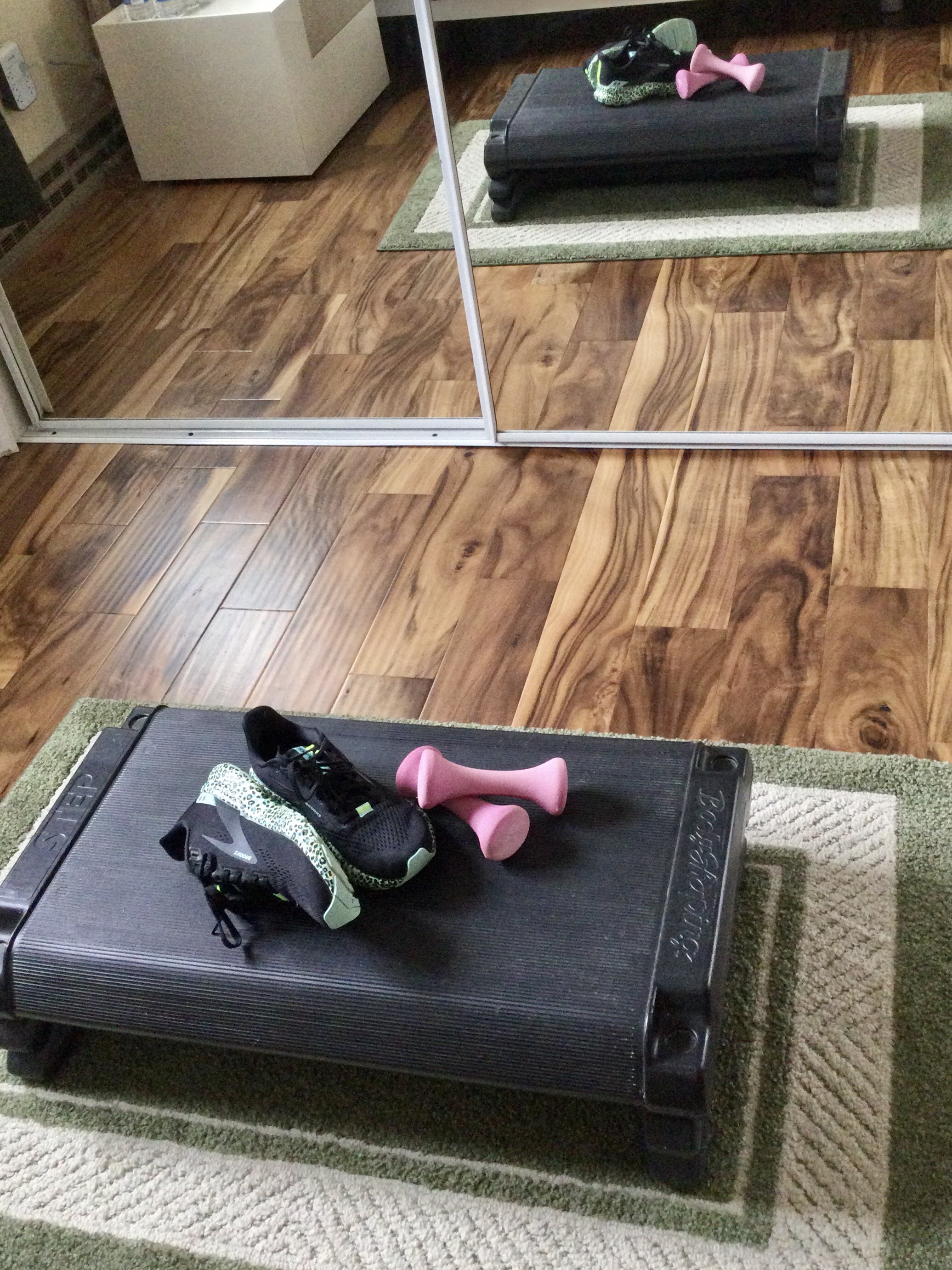 When I feel more motivated, I use my 1980s-style step aerobics block that my sister gave to me a couple of decades ago. It’s simple and fun. I just turn on my favorite drum and base beats and step away!