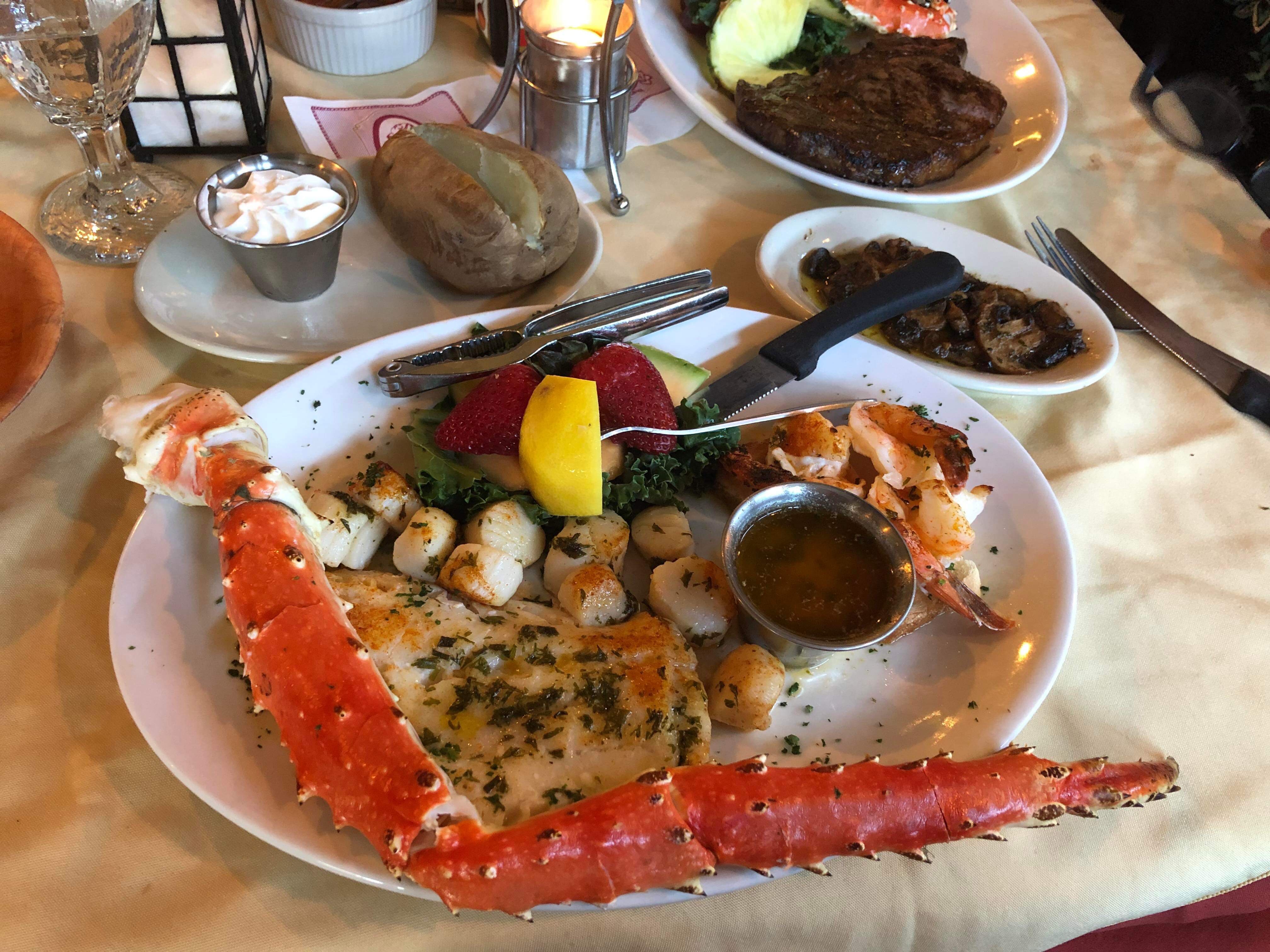 I ordered the Delmonico steak with Alaskan king crab. My daughter had Davy’s Locker, consisting of Alaskan king crab, shrimp, scallops and cod.