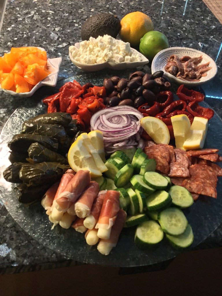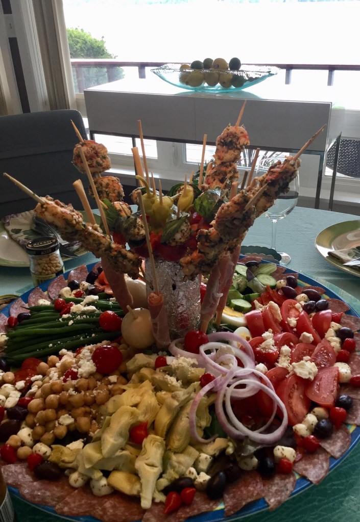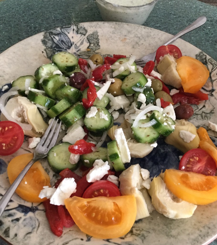 When it comes to salads, I prefer to use the broader Merriam-Webster dictionary definition – a hodgepodge. We just throw some of our favorite cold foods onto a serving platter. These meals are easy and nutritious. The ingredients are easily available this time of year, fresh from our garden!